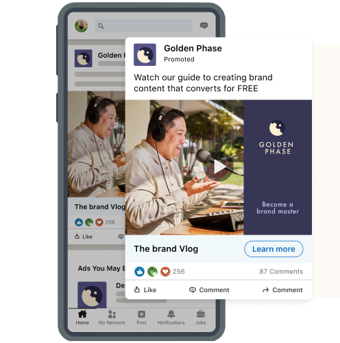 Anuncios multimedia que aparecen en los feeds de LinkedIn de los miembros específicos en computadoras de escritorio, tabletas y dispositivos móviles.