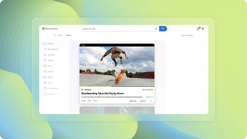Conecta con audiencias globales mediante anuncios nativos y de display en entornos seguros para la marca, como Microsoft Start, MSN, Microsoft Edge, Outlook y Microsoft Casual Games.